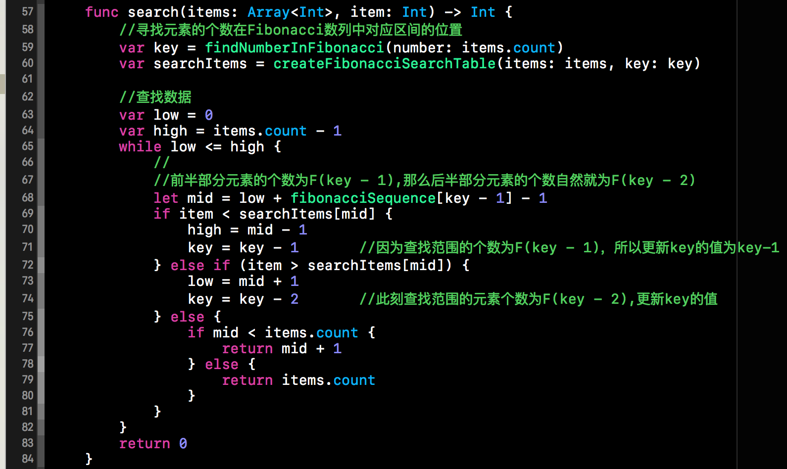 对查找表扩充完毕后,接下来就该进行查找了。下方是Fibonacci查找的核心代码。代码的具体步骤与上述的示例图是一一对应的。需要注意的一点是key值的更新。下方代码中的key其实就是Fibonacci数列的下标,当前范围内查找表的个数==F[key]。因为我们查找表的范围是不断缩小的,所以key值也是会变化的。我们将查找表(查找表的元素个数为F[key]) 分割为F[key-1](前半部分)与F[key-2](后半部分)两部分,如果将后半部分进行抛弃,那么key值就为key-1, 如果将前半部分抛弃,那么key=key-2,这一点需要注意。