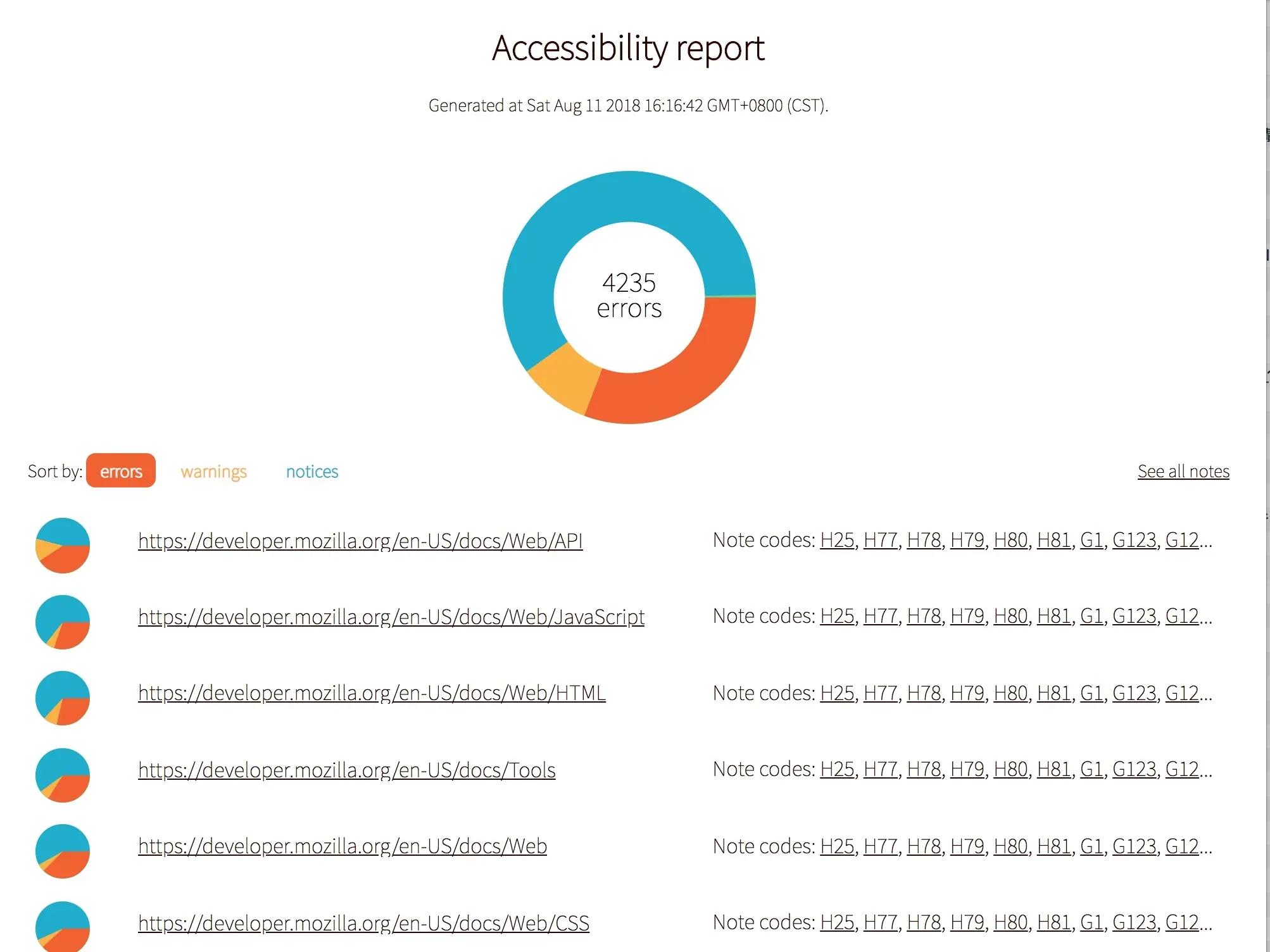 a11ym --standards WCAG2AA,HTML https://developer.mozilla.org/