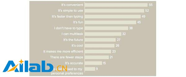 这次调查中有超过1000位英国智能手机用户参与。语音助手最大的用户群是年轻的男性。用户选择语音助手的三大原因分别是:方便、简单和比如输入更快。第四个原因竟然是有趣,很多人经常让语音助手给自己讲笑话。