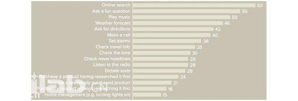 调查中还发现,22%的用户感觉在公众场合与自己的设备说话很尴尬,人们更喜欢在家中使用语音助手。同时,语音助手经常被用来执行在线搜索、播放音乐、查看天气情况和导航。