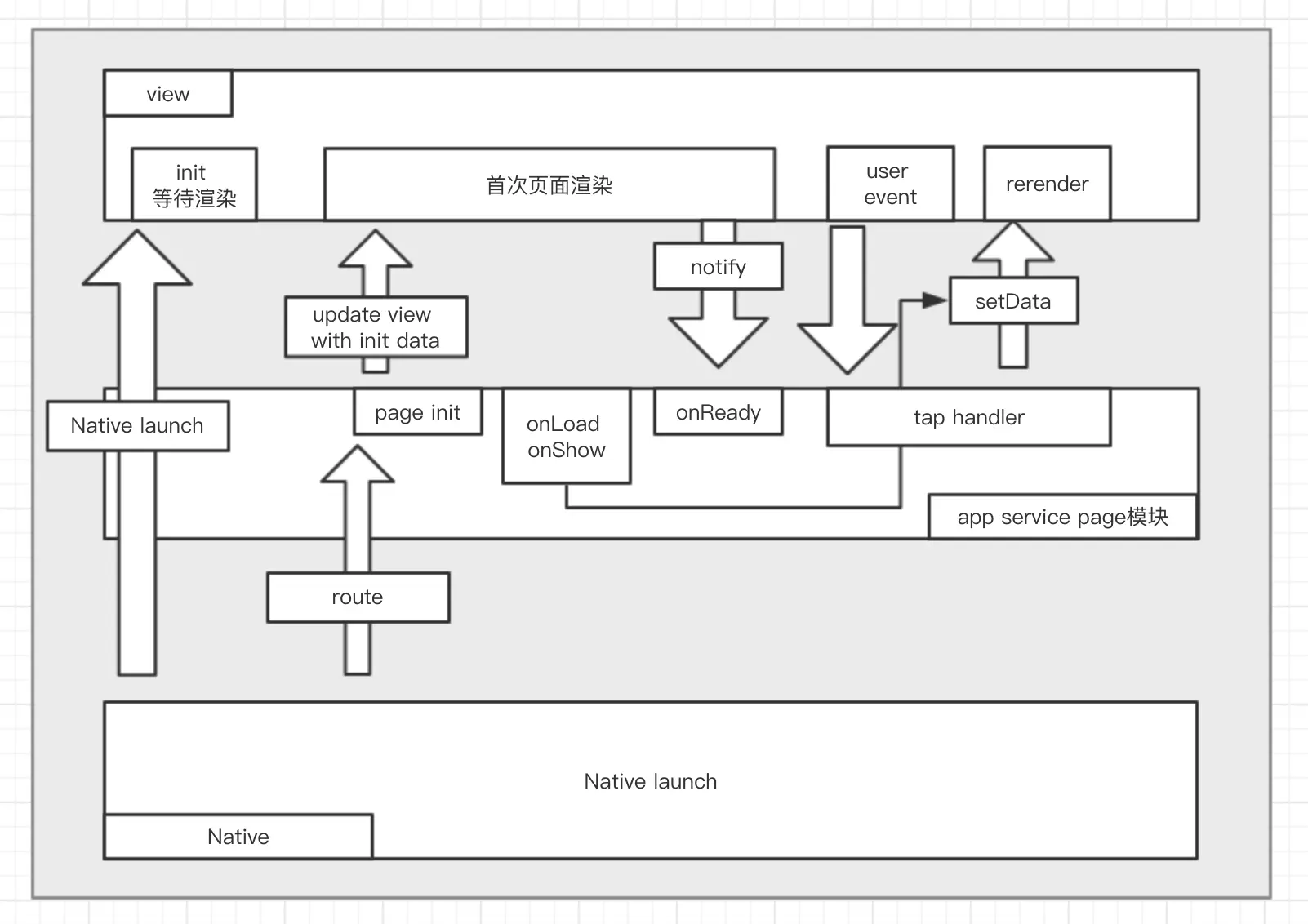 ③ View线程接到数据,开始渲染页面,渲染结束执行通知Page触发onReady事件