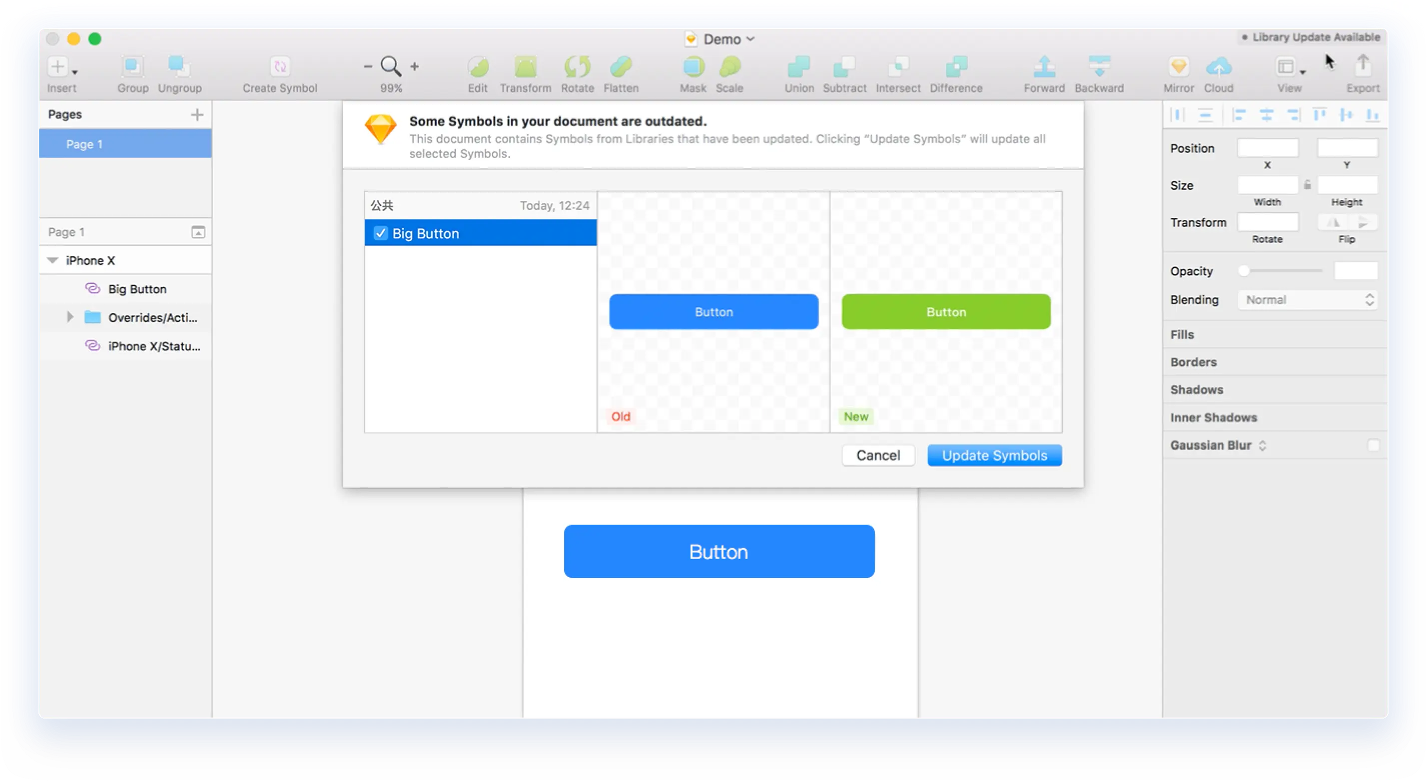 将蓝湖网盘内的 Sketch 文件添加至 Sketch Librabries,即可实现多人同步 Symbol 库,团队成员即可一键使用最新版公共 symbol。