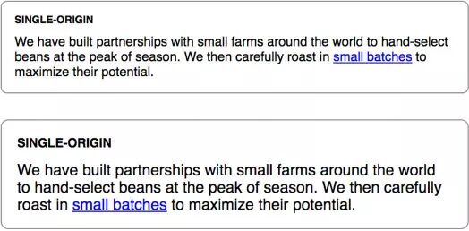 类似地,如果你的老板或者客户觉得现在网站的字号太小或者太大,你随时可以做到通过修改一行代码影响到全局的元素,这项改变会影响到页面上的其他元素,不费吹灰之力。