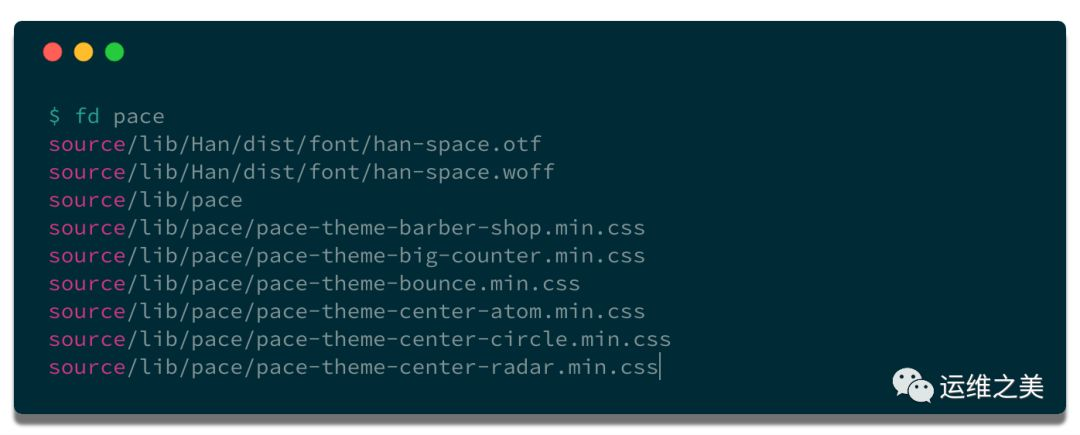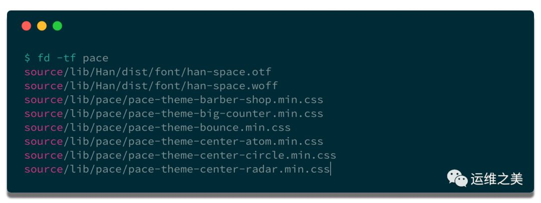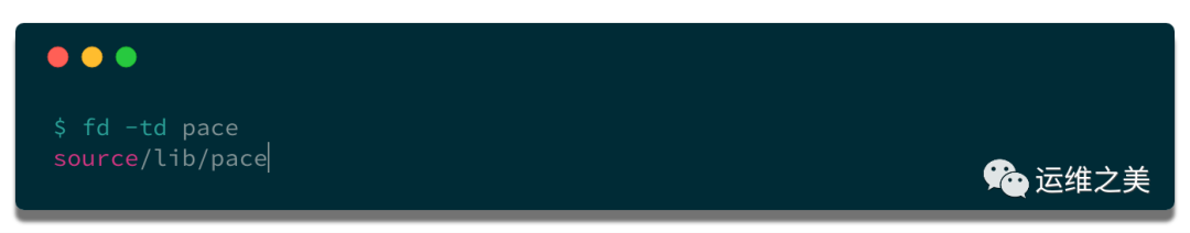 fd 只需带上一个需要查找的参数就可以执行最简单的搜索,该参数就是你要搜索的任何东西。例如:你想要找一个包含 pace 关键字的文件名或目录。