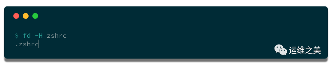 fd 支持隐藏文件搜索,如果你需要搜索隐藏文件可以加上 -H 参数。例:在当前目录下搜索关键字为 zshrc 的隐藏文件。
