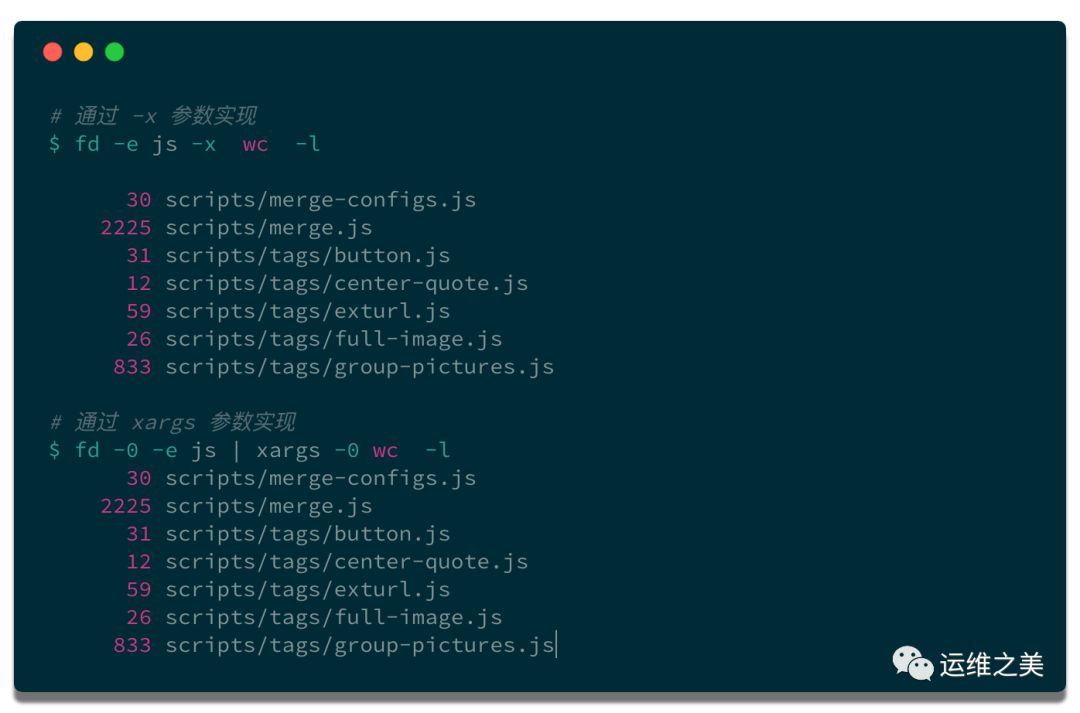实现的方式有两种:一是和 find 命令的类似的处理方法,通过 xargs 命令来关联相关命令处理。二是通过 fd 自己的 -x 参数来实现。