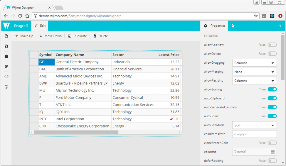 借助WijmoJS 在线Web Designer,您可以通过可视化设计界面来轻松构建具有WijmoJS纯前端控件的应用程序,该界面可让您轻松操作控件属性,子对象和集合。并且自动生成可以添加到项目中的纯Java代码和HTML,节省开发人员的项目设计和开发时间,最大限度地减少编码错误和拼写错误。