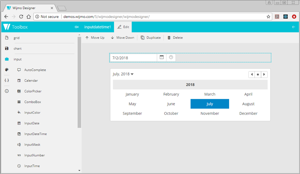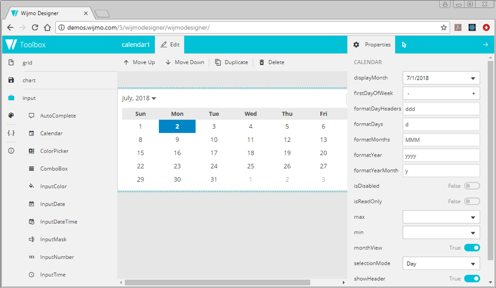 工具箱”命令打开一个可折叠的WijmoJS前端控件面板,按模块名称(网格,图表,输入,仪表,导航,OLAP)分组。 展开输入组并单击“日历”以添加名为calendar1的新控件。