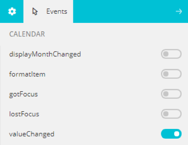单击“属性”选项卡右侧的箭头图标以显示“事件”窗格,该窗格显示所选控件公开的每个事件的切换按钮。对于打开的每个事件,WijmoJS 设计器将自动生成事件Java代码。如下图,打开valueChanged事件的前端控件。