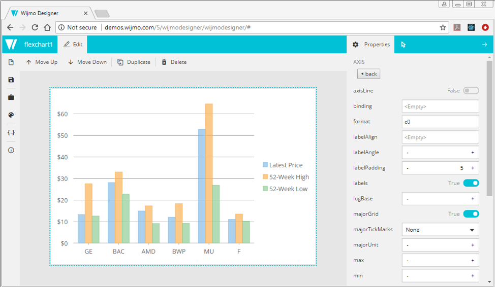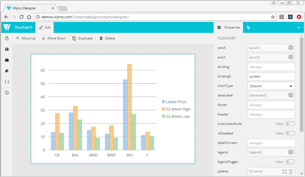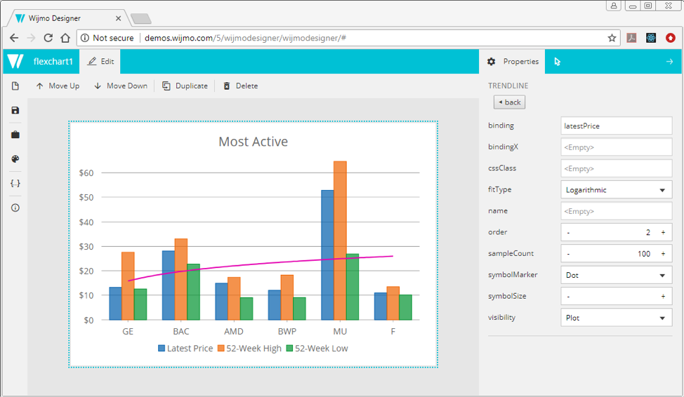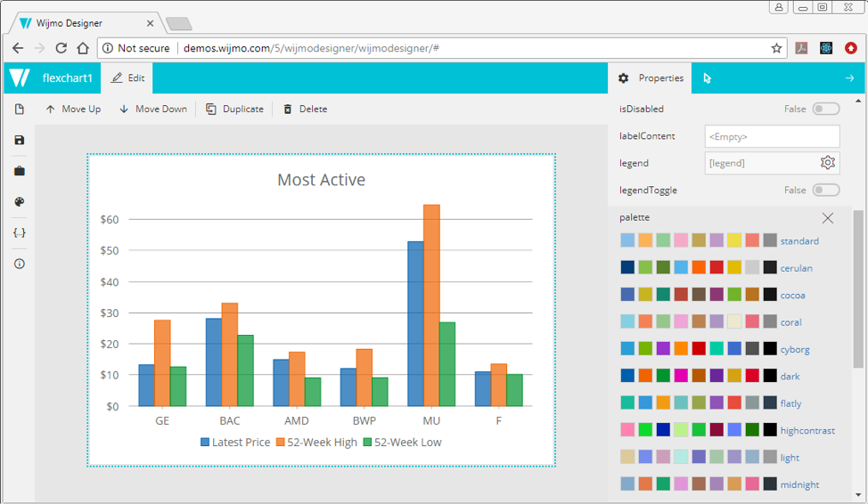现在让我们考虑一个更复杂的例子。 从设计图面删除所有控件,然后在“工具箱”中展开图表组,并单击名为FlexChart的项目。 请注意,该图表显示代表“最活跃”证券的实时样本数据。 这与首次打开设计器时默认FlexGrid中显示的数据集相同,仅限于前六行。