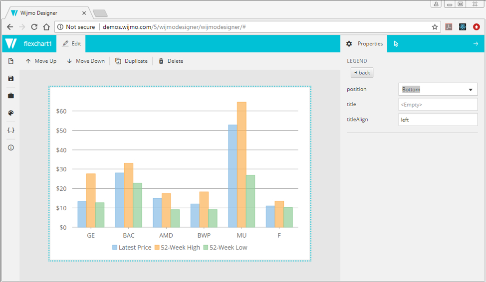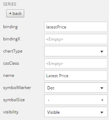 将鼠标悬停在最新价格上,然后单击出现的链接。 请注意,它具有latestPrice的绑定值,对应于数据源中的实际字段名称。 name属性(在图表图例中显示)具有适当的大小写和单词之间的空格。