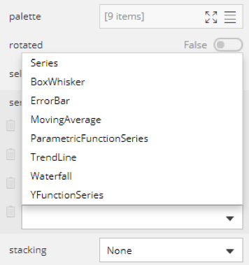单击后退按钮返回FlexChart设置,然后像以前一样展开系列属性。 现在单击“添加项目”链接以将新图表系列添加到集合的末尾。 单击新添加项目右边缘的向下箭头,然后从可用系列类型列表中选择TrendLine。