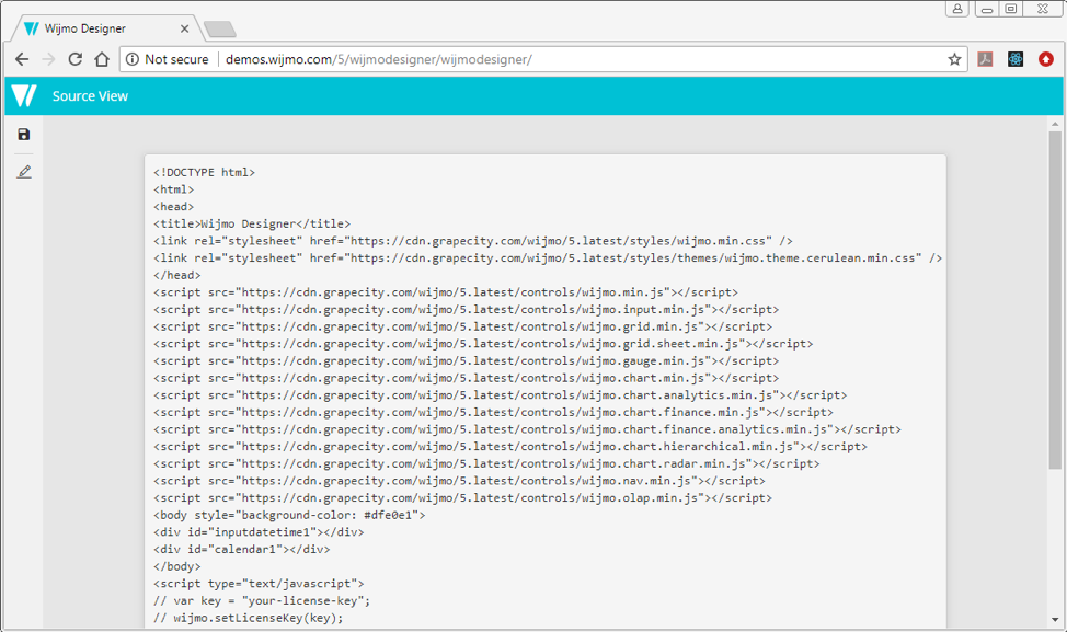 如果您对当前WijmoJS可视化在线Web设计器的设计效果感到满意,则可以生成在应用程序中使用的代码。单击WijmoJS 徽标以关闭“主题”列表,然后单击“源视图”以显示生成的HTML 和 Java。