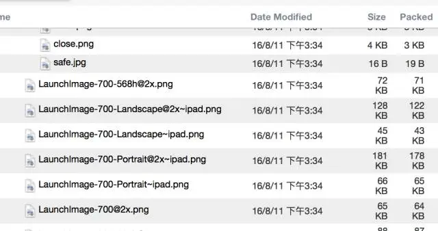 从上面的结果来看,安装包的大小基本等于图片资源的大小,可以看一下IPA的内容详情视图(下图), 发现图片确实没有怎么压缩: