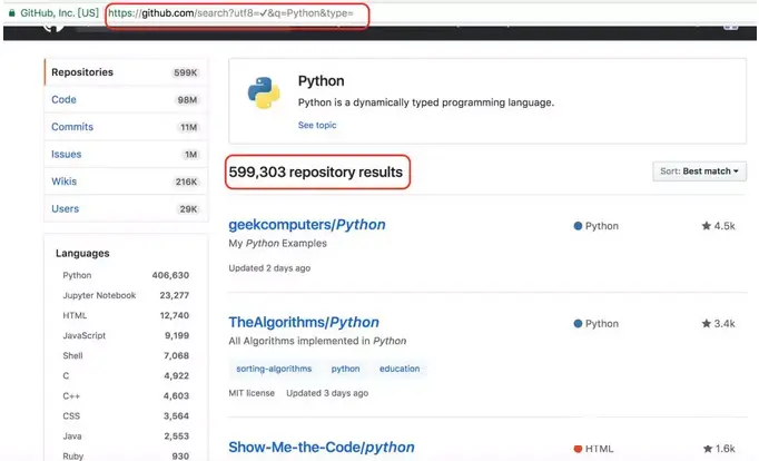 Github的网站结构非常简单,也没有啥反爬虫的策略,我们在主页搜索Python就会进入Python相关的主题页面