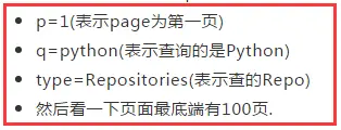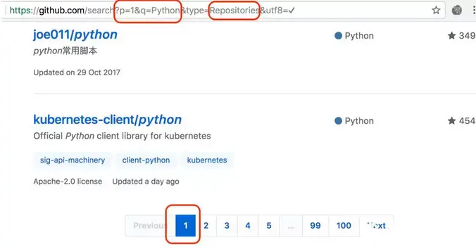 了解上面的url规则之后,其他的网页只要改改上面的参数就行了,比如第2页,github.com/search?p=2&….