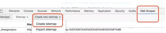 #####3.启动Webscrapy 网页空白处点击右键选择检查,会进入我们属性网页审查元素的那个界面,在最末尾多一个webscraper菜单,点击Create sitemap创建一个sitemap