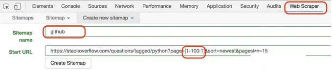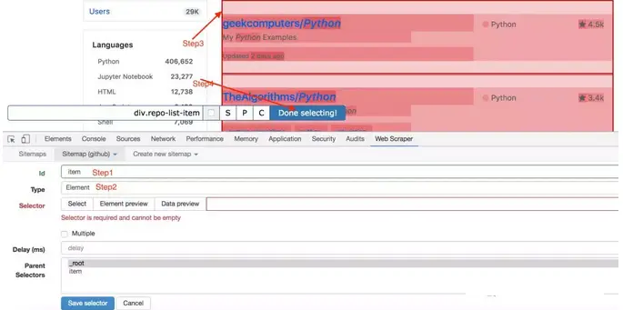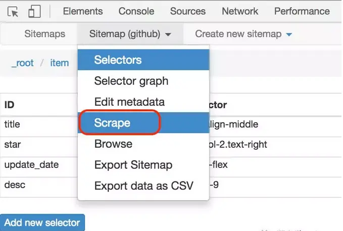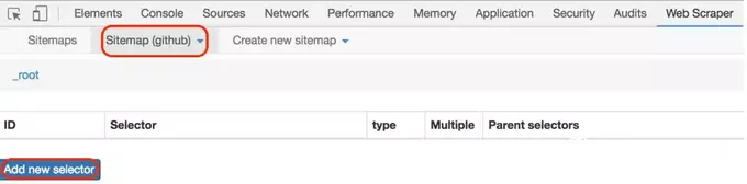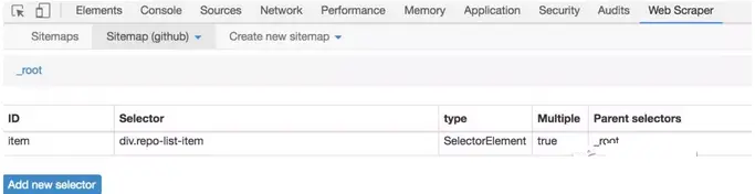 1). 增加一个selector 选择我们的Sitemap是Github,然后开始增加一个selector