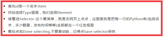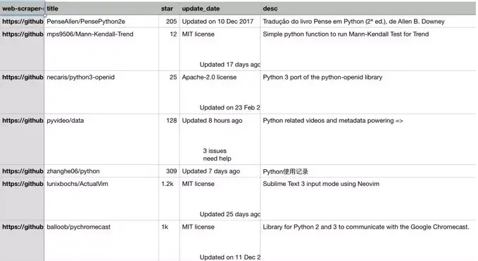 #####4.爬取每一页的内容 Github上的Python的库都是一个一个规整的大列表,webscrapy支持很多类型的不同网页元素的爬取,比如文本,超链接,图片,Element等等,真是用心良苦啊,考虑的非常周全.