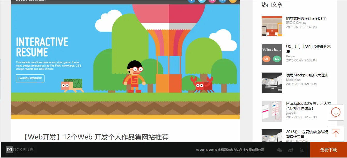 摹客是一个协作设计平台,正逐步完善从原型设计到实现开发的过程。不仅提供了国内外知名的原型设计工具Mockplus,也非常注重设计规范的制定,而且设计系统可以导出代码!它的网站博客提供了非常丰富的设计资源,包括优秀的网页设计模板,以及优秀的网页开发案例相关的资源。虽然并不是专门的网页开发博客,里面提供的内容也可以为开发者带来一些灵感。从而从最初始的原型设计为出色的网页开发打下坚实的基础。