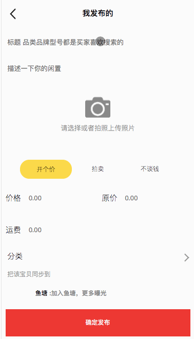 一样,只有在已登录的状态下才可以进入到发布的界面,发布就是充当着一个卖家的身份,需要填写商品详情的相关信息包括图片,价格等。通过验证才可发布成功,同样利用了vuex来保存发布的商品信息,再跳至我的页面中的我发布的页面进行数据输出。