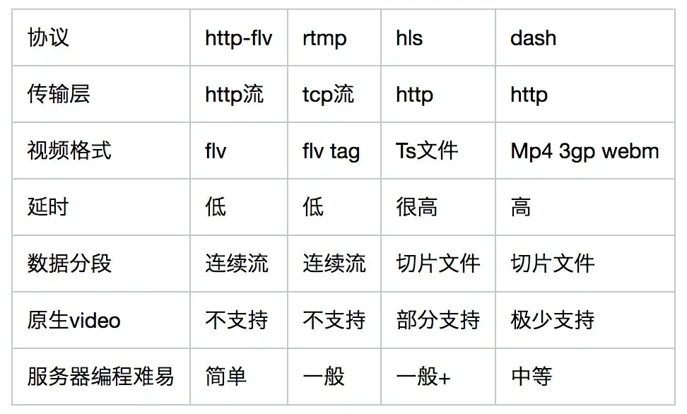 可以看到,flv由于其编码格式的特点,只需要一个MetaData 以及音视频Track各自的Header就可以在任意的时间点播放,极大地符合实时直播的需求,在GOP足够小的情况下甚至可以达到0延迟,可以说在现有的技术方案里,http-flv是最理想的一个,正是因此,flv依然是web播放器不可或缺的一个格式支持。