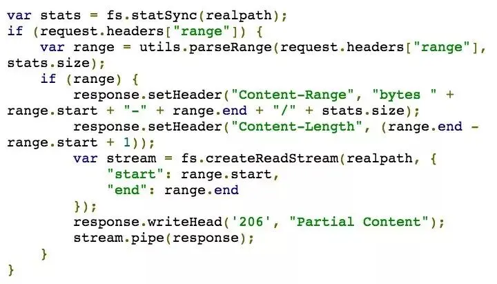 如上图,Range这个参数向服务器描述了希望加载一个flv文件的 100000 到 3987705 个字节 这段数据,相应的,服务器也需要能够根据Range参数正确返回这段数据。这里展示一个极简的服务端代码: