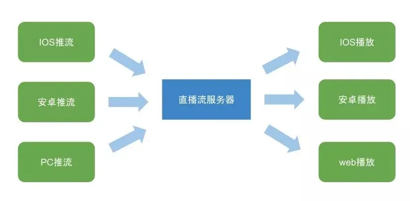 再看一下直播:直播跟点播是非常不一样的数据流动结构,我们看一下简单的直播流程