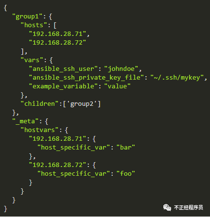 用于生成 JSON 的脚本对实现语言没有要求,它可以是一个可执行脚本、二进制文件,或者其他任何可以运行文件,但是输出必须为 JSON 格式,同时必须支持两个参数: --list 和 --host <hostname>。