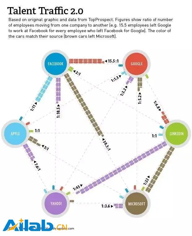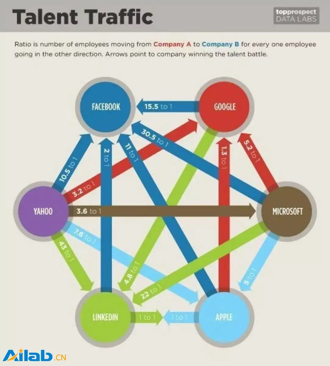 早在2011年7月,微软的人才流失情况就已经被媒体注意到。福布斯在一篇名为“硅谷人才争夺战中的赢家和输家”(Winners And Losers In Silicon Valley's War For Talent)的文章中,给出了上面这张人才流向图。在苹果、LinkedIn(后被微软收购)、Yahoo、Facebook和谷歌的人才双向流动上,微软成为从竞争对手方面人才流入最少,但流出最多的公司。