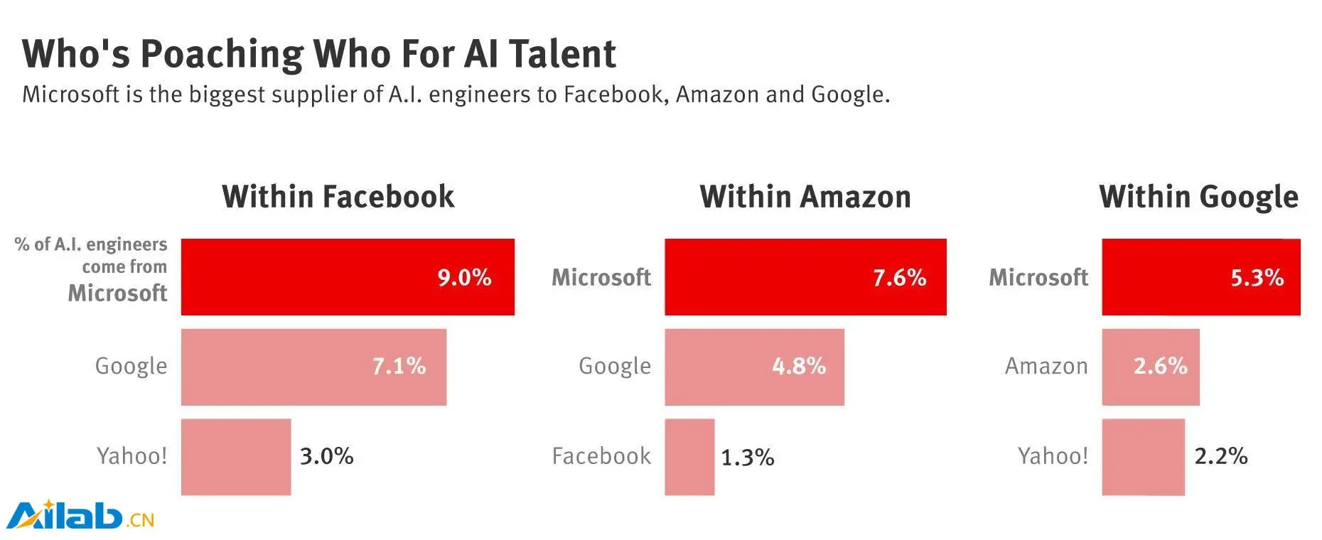 微软在AI人才上的深度储备,让它成为其竞争对手最大的“挖角”地。Facebook的AI人才中,有3%来自雅虎。而谷歌的AI 人才中,有2.6 %来自亚马逊,5.3%来自微软。