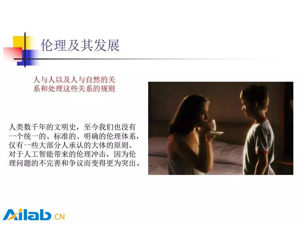 通俗的说:伦理就是指“人与人以及人与自然的关系和处理这些关系的规则”,人类数千年的文明史,至今我们也没有一个统一的、标准的、明确的伦理体系,仅有一些大部分人承认的大体的原则。对于人工智能带来的伦理冲击,因为伦理问题的不完善和争议而变得更为突出。
