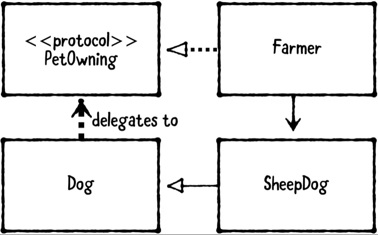 如果一个箭头的意义很明确,可以删除一些解释性文字,通常可以删除继承,属性和实现的解释文字。然而,应该保留依赖的文字。因为,他们的意义通常不太明确。 下面是一副表示 Farmer 和 Dog 的完整的 UML 图。Dog 代理到 PetOwning 对象。