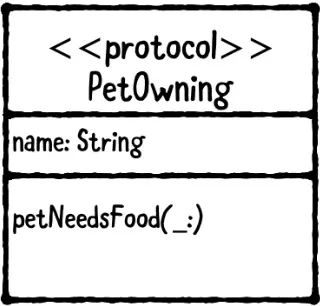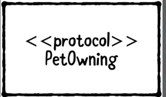 在 UML 图中,也可以使用方块表示一个协议,为了区别类,需要在协议名前面加上<>。 下图表示一个 PetOwning 协议: