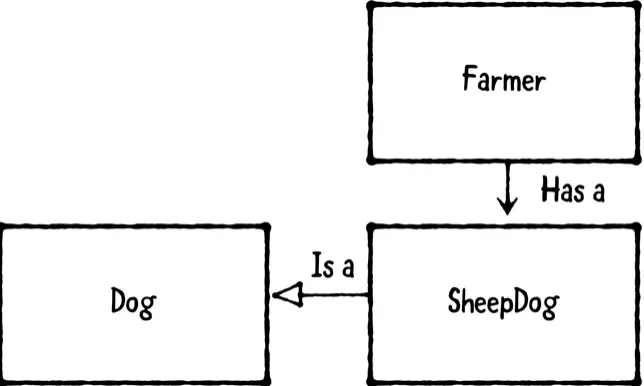 可以在一个 UML 图中使用多个箭头和方块,下面这个图表示一个 Farmer 有一个 SheepDog,这个 SheepDog 是一个 Dog。
