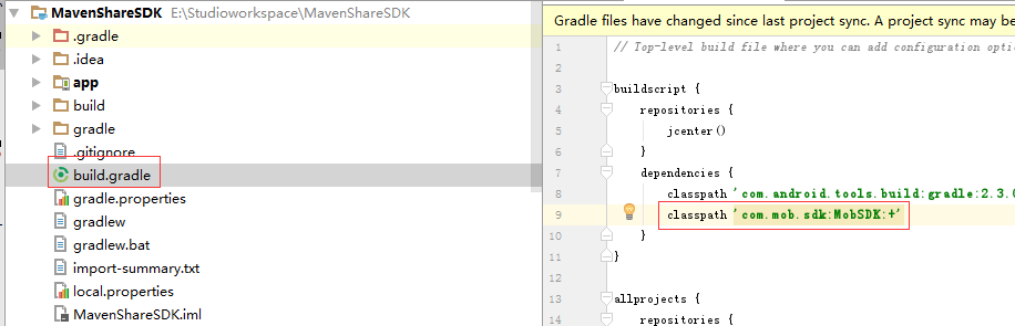 1、打开项目根目录的build.gradle,在buildscrip–>dependencies 模块下面添加 classpath ‘com.mob.sdk:MobSDK:+’,如下所示;