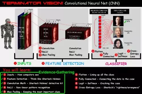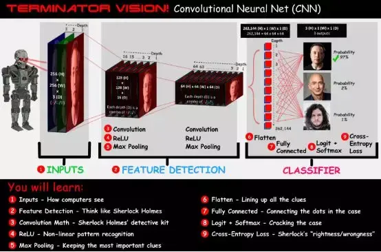 我们首先假设,在终结者的大脑中有一个名叫'Sherlock Convolution Holmes'的特殊侦探。他的工作就是仔细查看证据(输入图像)并使用敏锐的眼睛和推演能力(特征检测),预测图片中的人物是谁以此来破案(正确分类图像)。