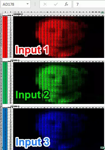 将数码照片看作3个电子表格(1个红色,1个绿色,1个蓝色)堆叠在一起,每个电子表格都是一个数字矩阵。拍摄照片时,相机会测量每个像素的红色,绿色和蓝色光量。然后,按 0-255 的等级对每个像素进行排名,并将它们记录在电子表格中: