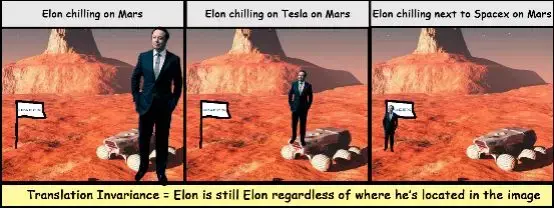 无论他在图像中什么位置(平移),什么大小(尺度不变),卷积神经网络经过训练都能识别到 Elon 的特征。CNN 擅长识别图像任何部分的模式,然后将这些模式叠加在一起,以构建更复杂的模式,就像人类一样。