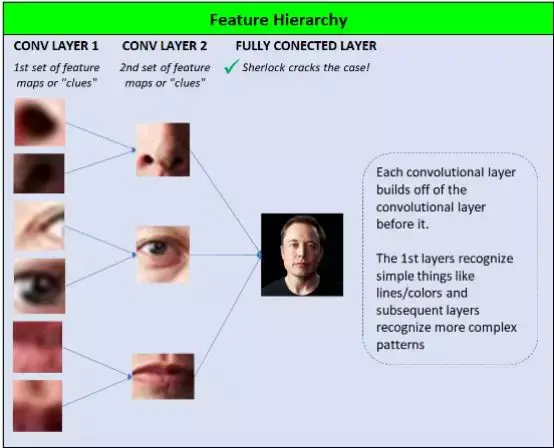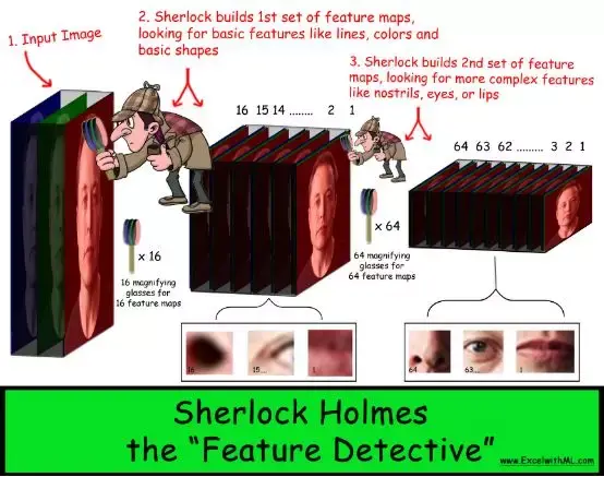 Sherlock 使用放大镜,仔仔细细地检查每一张图像,找到该图像的重要特征或“线索”。然后将这些简单的线条和形状特征堆叠在一起,就可以开始看到像眼睛或鼻子这样的面部特征。