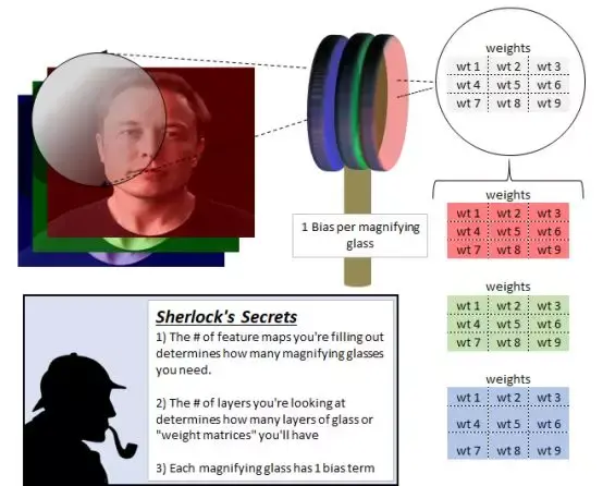 一开始,Sherlock查 看的输入图像,它有3层,红色,绿色和蓝色。所以,我们的放大镜也有 3 层。当我们构建 CNN时,随着层深度增加,我们的放大镜也会变得更厚。
