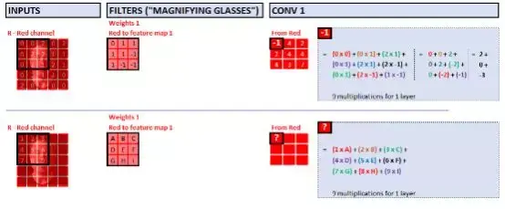 在下面的例子中,我们将使用 5x5x3 的输入图像和 3x3x3 的滤波器,每个像素点需要 27 次乘法: