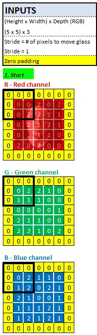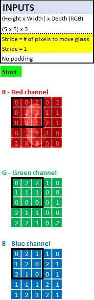 如果我们将每种颜色分成单独的矩阵,就会得到 3 个 28x28 矩阵,而每个矩阵都是训练神经网络的输入: