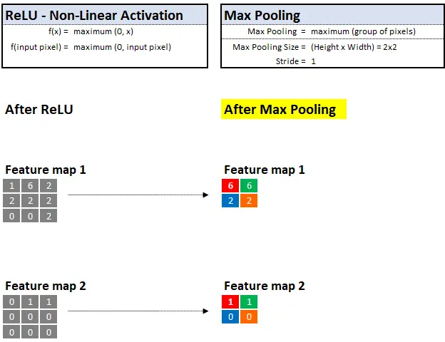 为了在 CNN 中引入非线性,我们使用称为 Relu 的激活函数。从第一个卷积计算我们的特征图之后,激活函数会检查每个值来确认激活状态。如果输入值为负,则输出变为零。如果输入为正,则输出值保持不变。ReLU 的作用类似于开/关,每个特征图的像素值经过 Relu 后,就得到了非线性的模式识别。