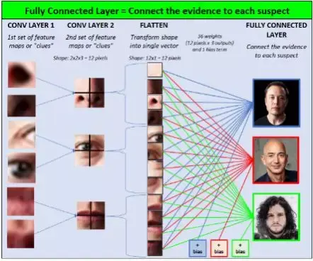 在全连接层中,我们将证据与每个嫌疑人相连。换句话说就是我们在展示证据与每个嫌疑人之间的联系。