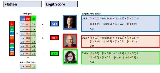 每一个证据乘以连接证据与输出的权重。所有这些乘法都加在一起,然后在末尾添加一个偏差项,得到的最高分就是模型的猜测。