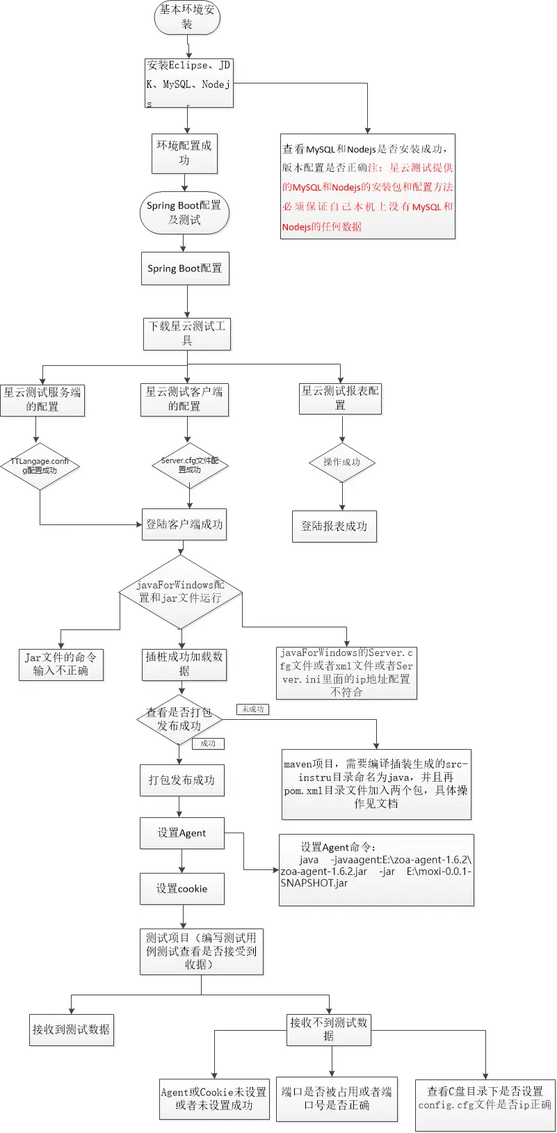 本次环境搭建分为基础环境准备、springboot环境搭建、精准测试环境搭建、精准测试与springboot环境对接等一整套完整的配置过程,用户可以通过下图中的流程图确认自己所部署过程中进行到的阶段点,从而排查部署中可能遇见的问题。