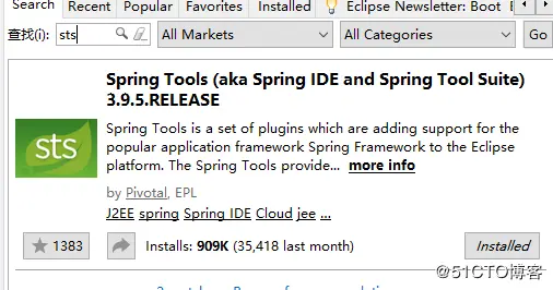 Eclipse安装Spring Boot插件,Help-Eclipse Marketplace,搜索Spring Tools安装STS,如图: