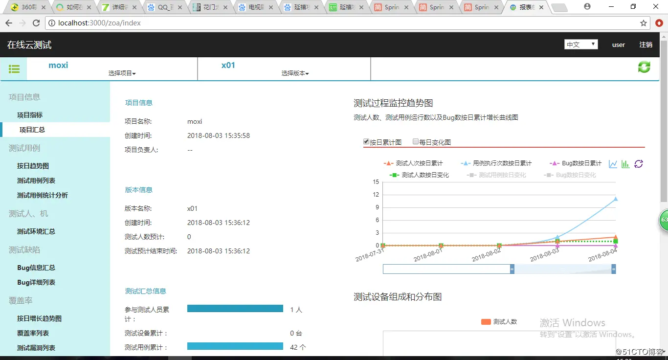 项目指标信息、项目信息、版本信息、测试汇总信息、测试过程监控趋势图、测试设备组成和分布图、版本覆盖率汇总图、复杂度统计图