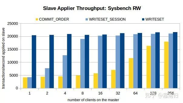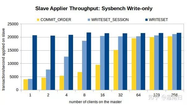 3、性能提升MySQL High Availability对开启了WriteSet的复制性能做了测试,这里直接将测试结果搬运过来,有兴趣的可以直接访问原博客。